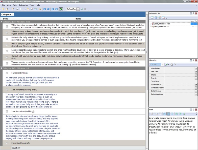 This Baby Milestone checklist is a brief chart (with explanations and tips) of baby milestone events on the glorious path through his/her early period of development (8 weeks-24 months). With a help of this Baby Milestone checklist you can learn how your babe is supposed to grow (however, this is not a strict rule for everyone, but just the most common way which supports different variations).   Baby Milestone Checklist