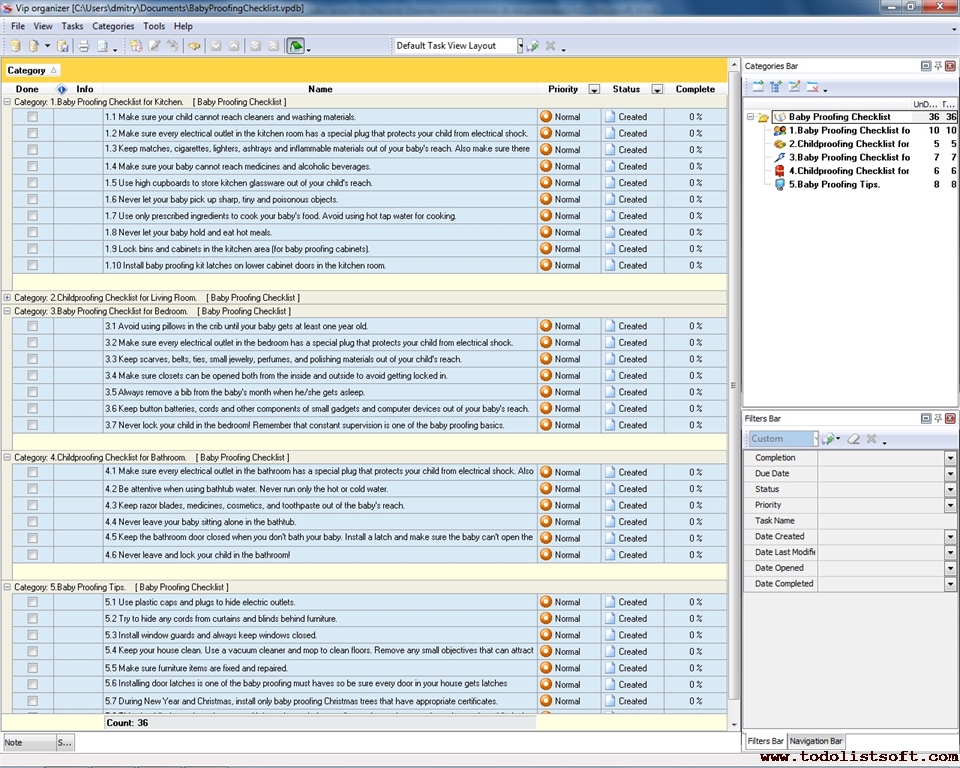 This useful Baby Proofing Checklist includes a series of household precautions and recommendations that will help make any house safer and more convenient for children. It will be very helpful for parents whose baby just begins to crawl. Baby Proofing Checklist