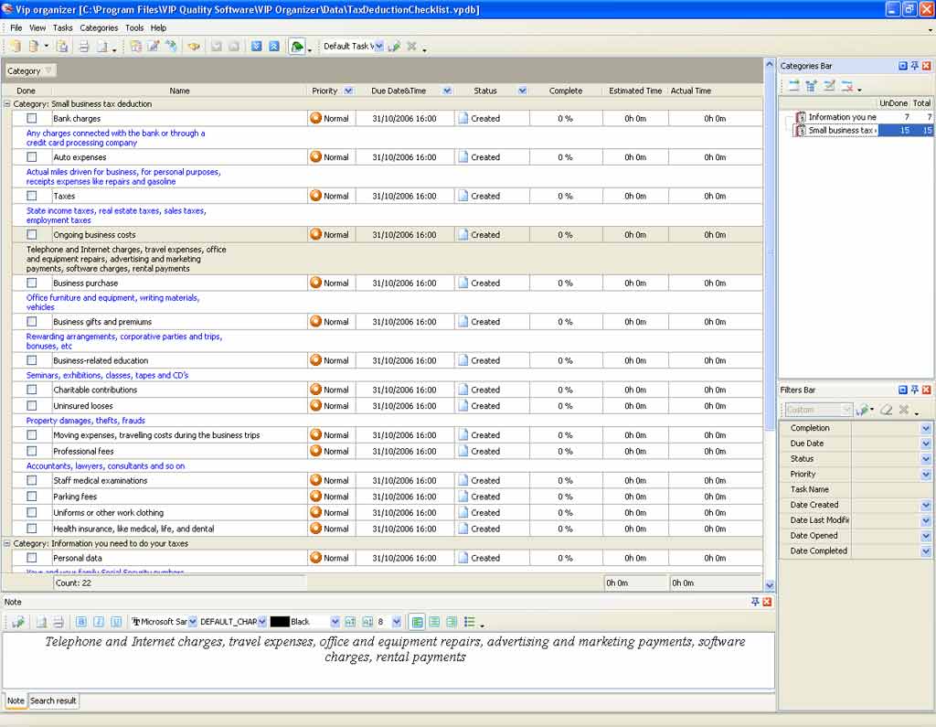 Tax Deduction Checklist Tax Deduction Checklist is a 'to do list' for you to make all required preparations before deducting. Use this Tax Deduction template as a checklist to be tax-savvy throughout the year and not to forget all deductible incidental expenses that you paid throughout the year.