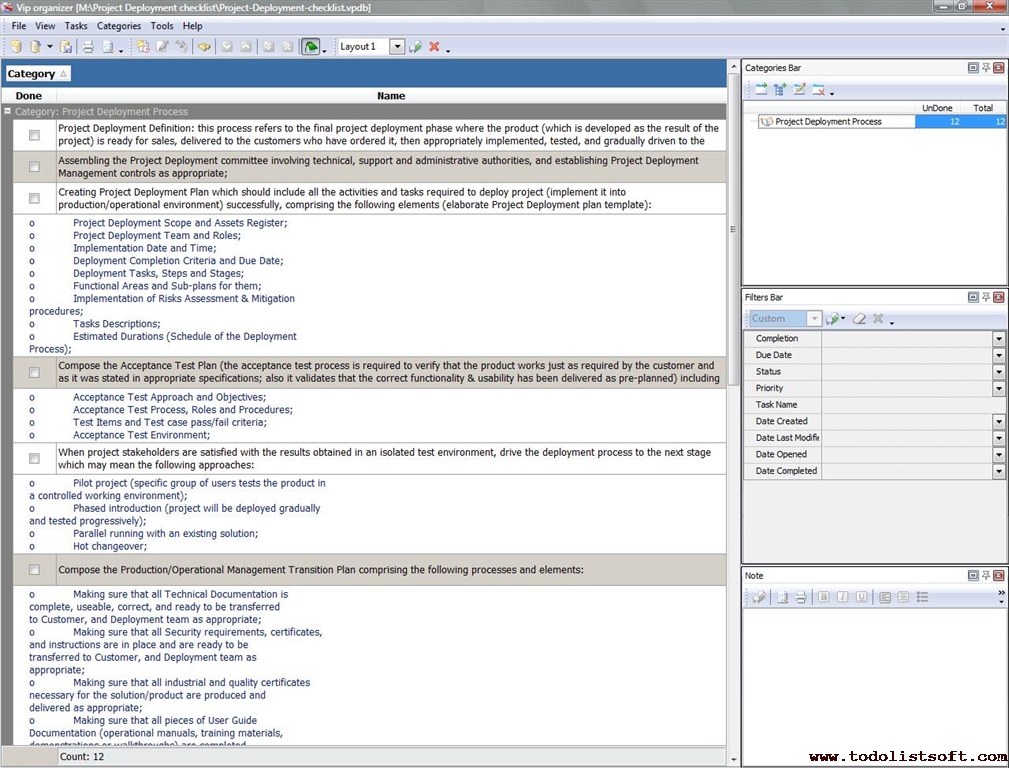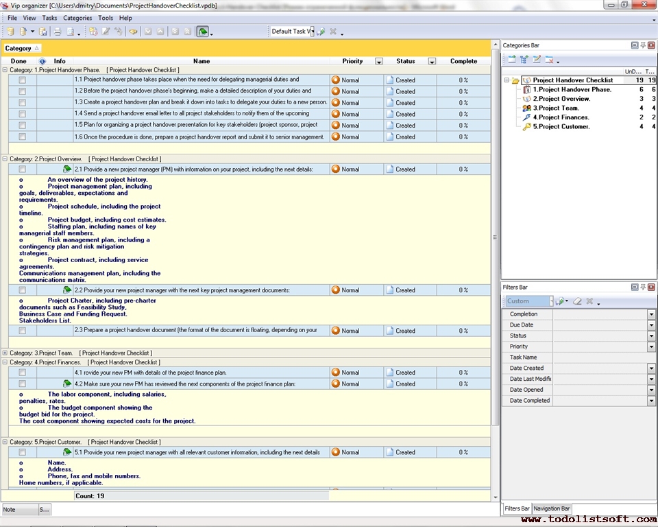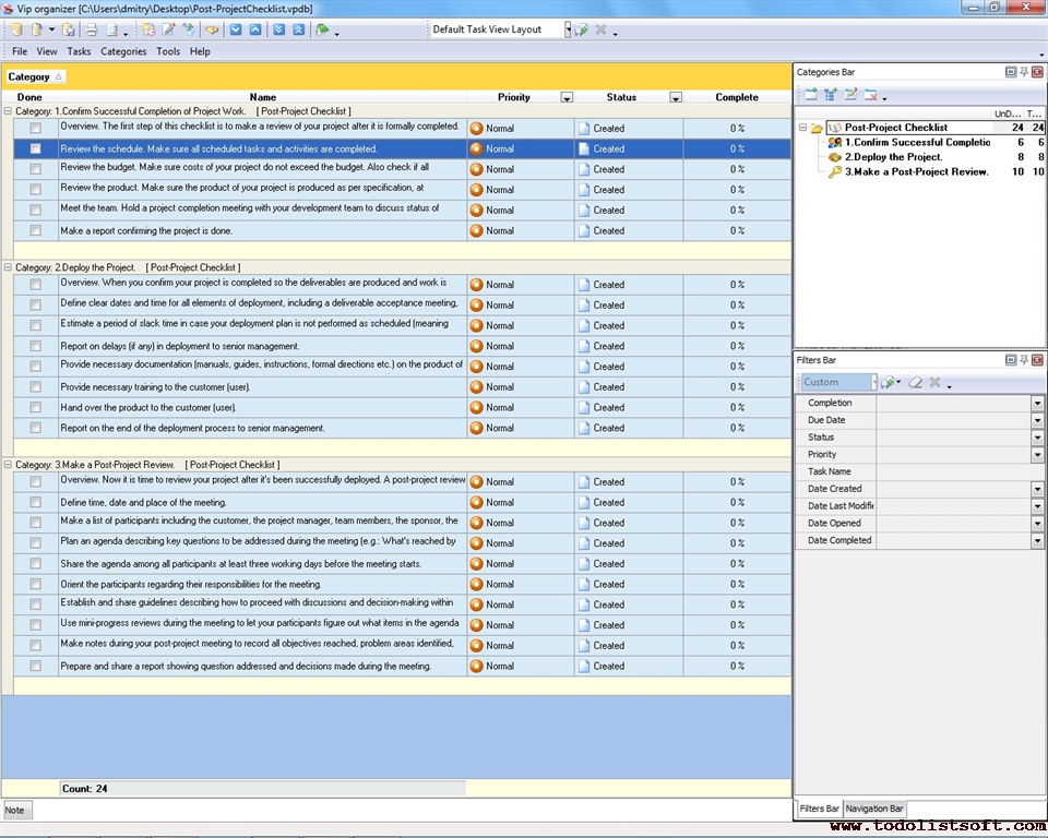 This Post-Project Checklist is designed to help you review your project and hold a post-implementation meeting after the project has been successfully completed and deployed. You can use VIP Organizer software to upload the checklist and use it in your daily practice of project management.