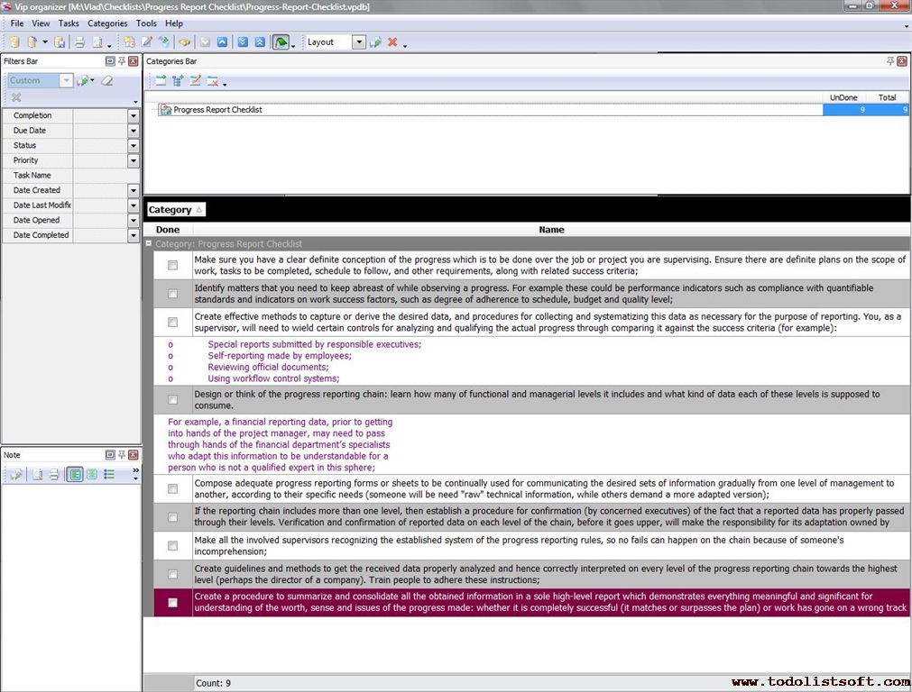 This Progress Report Checklist is composed to help everyone who is in charge to measure and control progress over certain tasks or projects (project managers, task supervisors, etc). With a help of this checklist you will be able to inspect if everything necessary for this function is ready.