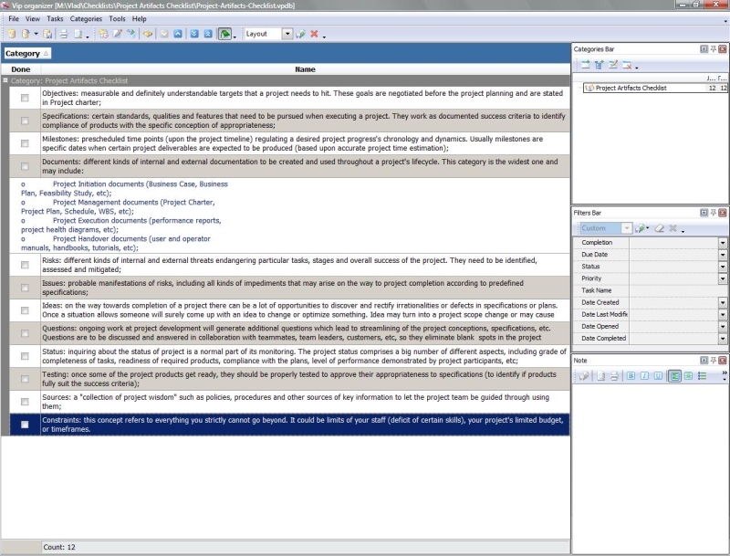 This Project Artifacts Checklist is a collection of matters which any project is based upon. If all the matters listed in this checklist are properly respected on your project, then you have laid a strong fundament for project’s success.