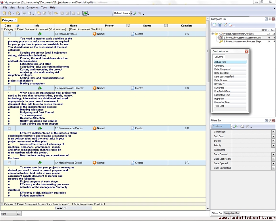 The next Project Assessment Checklist helps you monitor and control your project through assessing its basic processes and measuring performance and efficiency at each project stage. You can use the checklist throughout the entire lifecycle of your project to make sure that the project shows expected performance and keeps to the baseline.