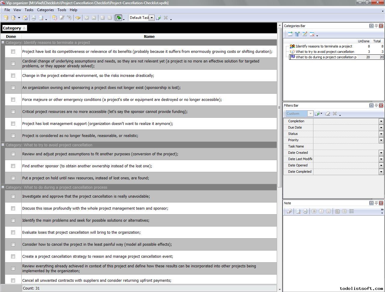 Project Cancellation Checklist is composed to help project managers in terminating their projects before the appointed time (shutting their projects down) due to some reasons. With a help of this checklist you can identify your reasons, try to prevent cancellation, and actually shut your project down appropriately.
