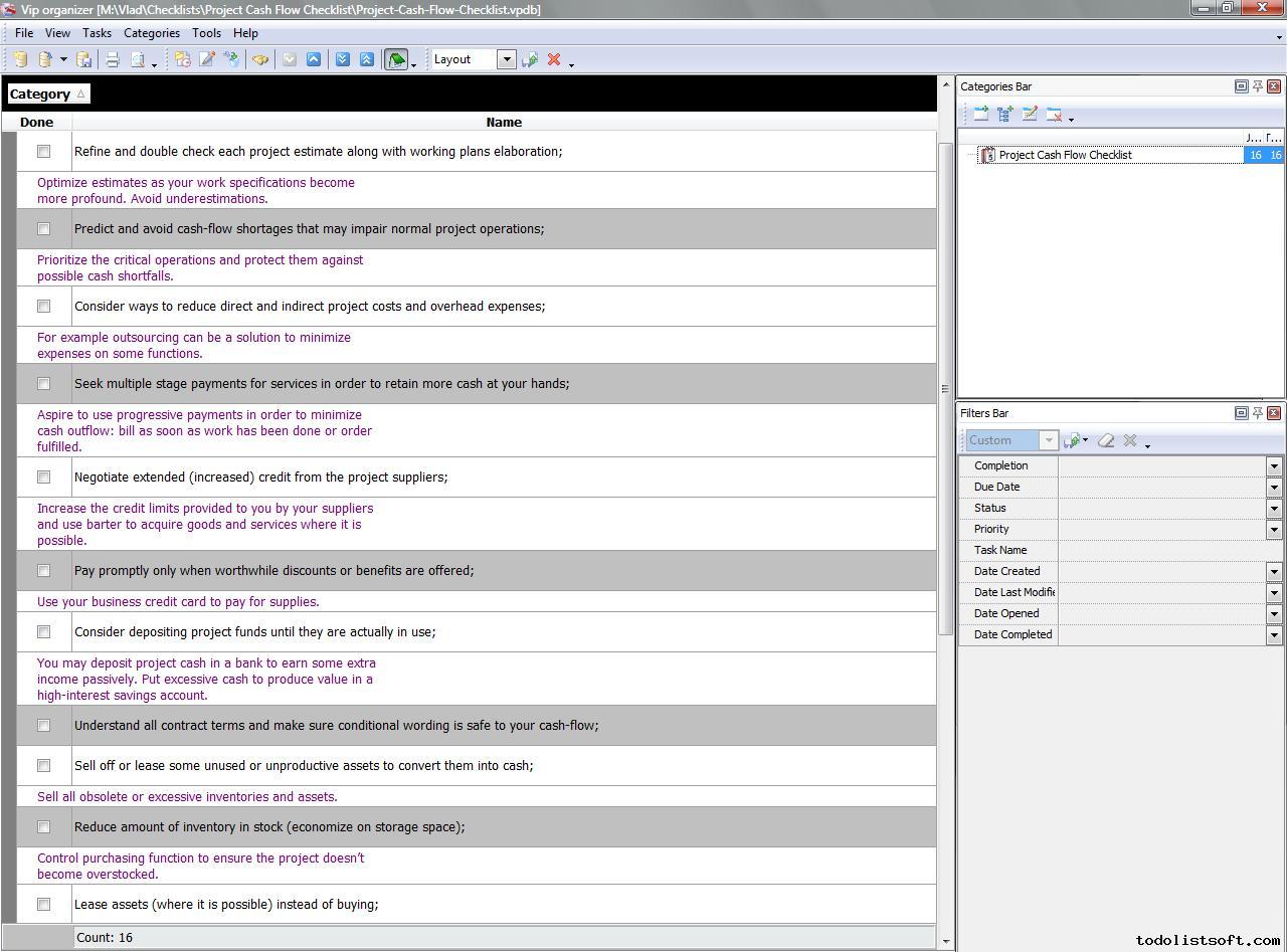 Project Cash Flow Checklist is composed for project managers who want to create and operate an essential cash reserve on their projects. In this checklist you can find a number of useful tips on how to retain and generate cash-flow on your projects.