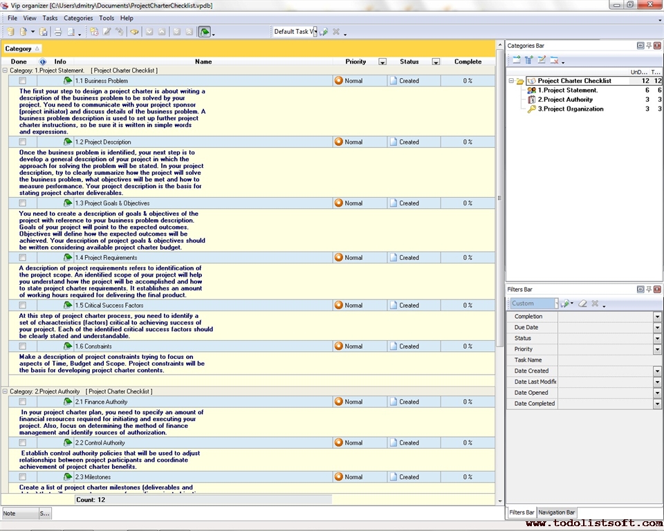This Project Charter Checklist includes tips on the development of a project charter which is the primary document at the project initiation phase. Following the checklist will help you understand how to make an overview of your project, set project authority and milestones, and solve aspects of project organization.