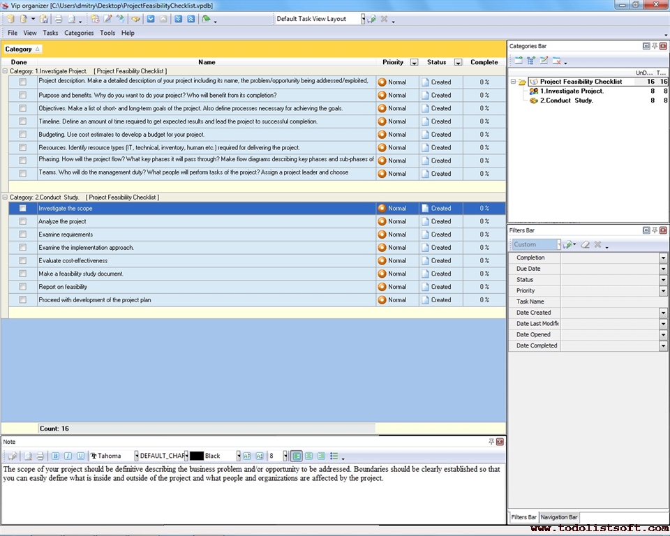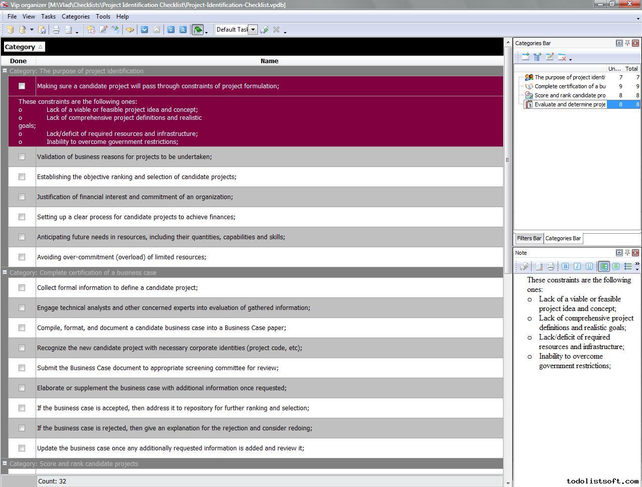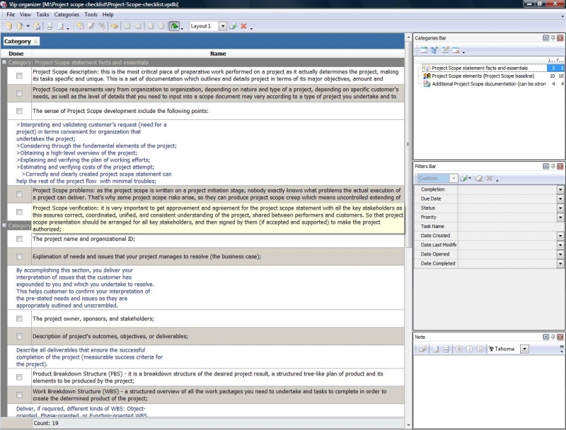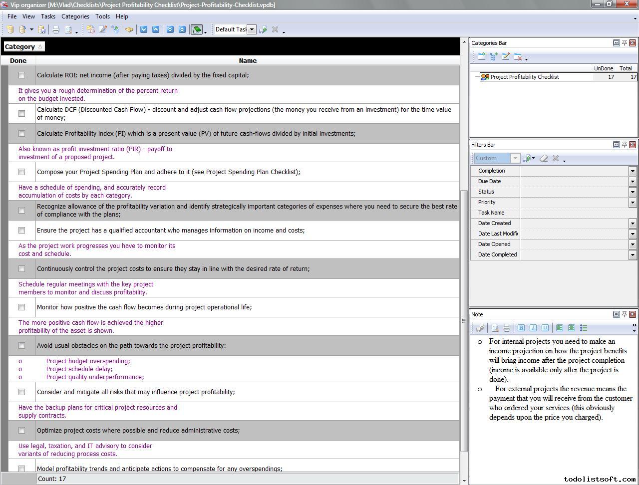 Project Viability Checklist is created for all business and project managers who wish to learn the principles to prevent their projects from losing their maximal benefits. With a help of this checklist you can correct and examine your managerial actions to know whether they secure or contradict the viability of your projects.