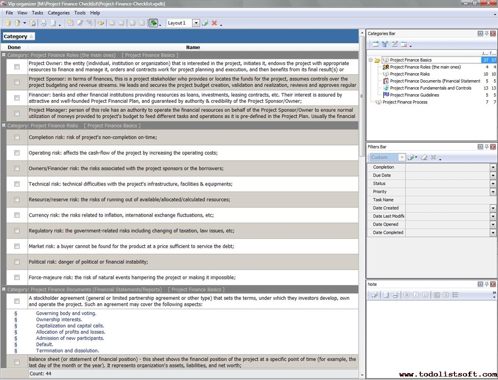 Project Analysis Checklist is created to help the project managers in conducting all-round analysis of their projects before they are started and while they are on the run. In this checklist you will find information on how to analyze project’s background, environment, organization and other things.