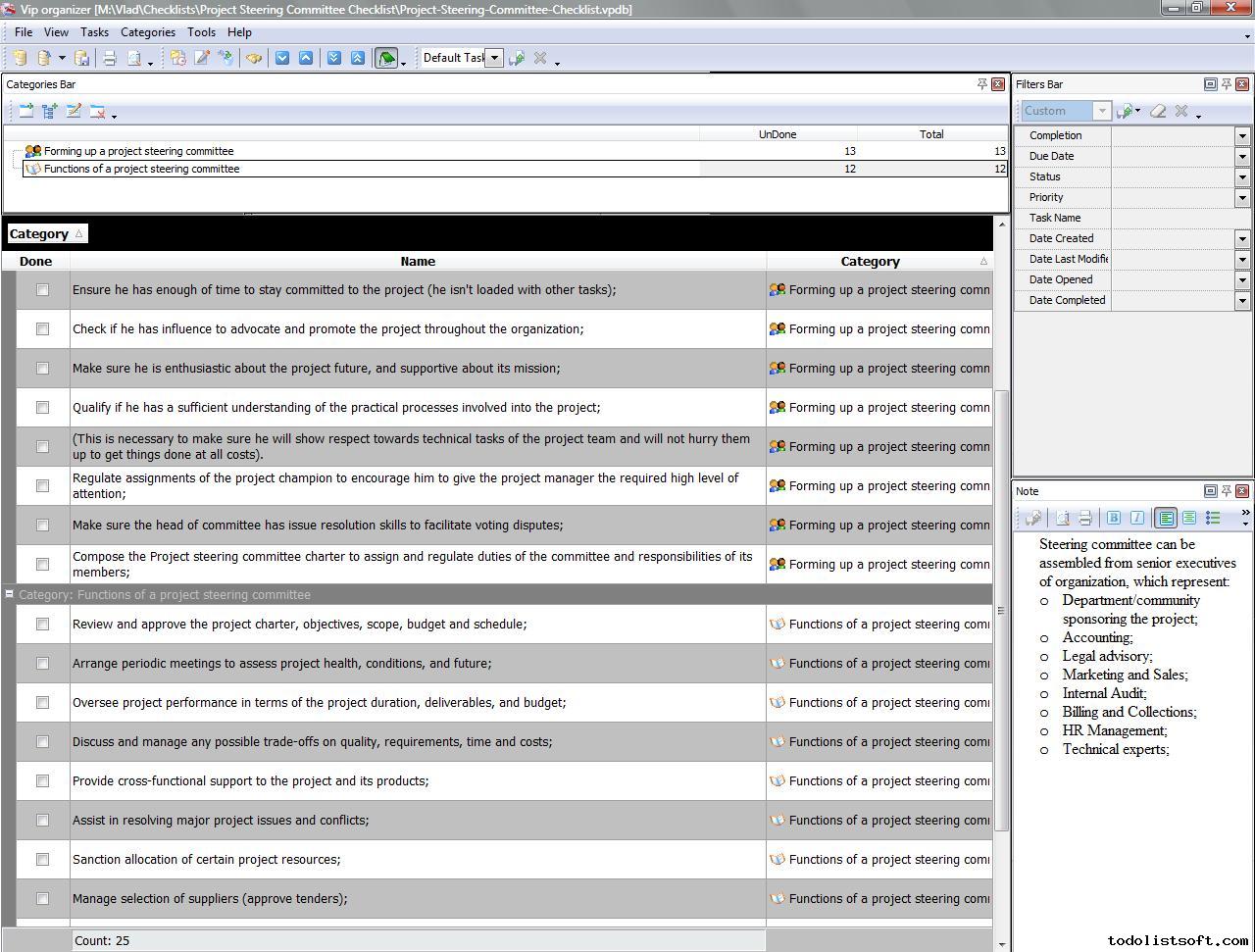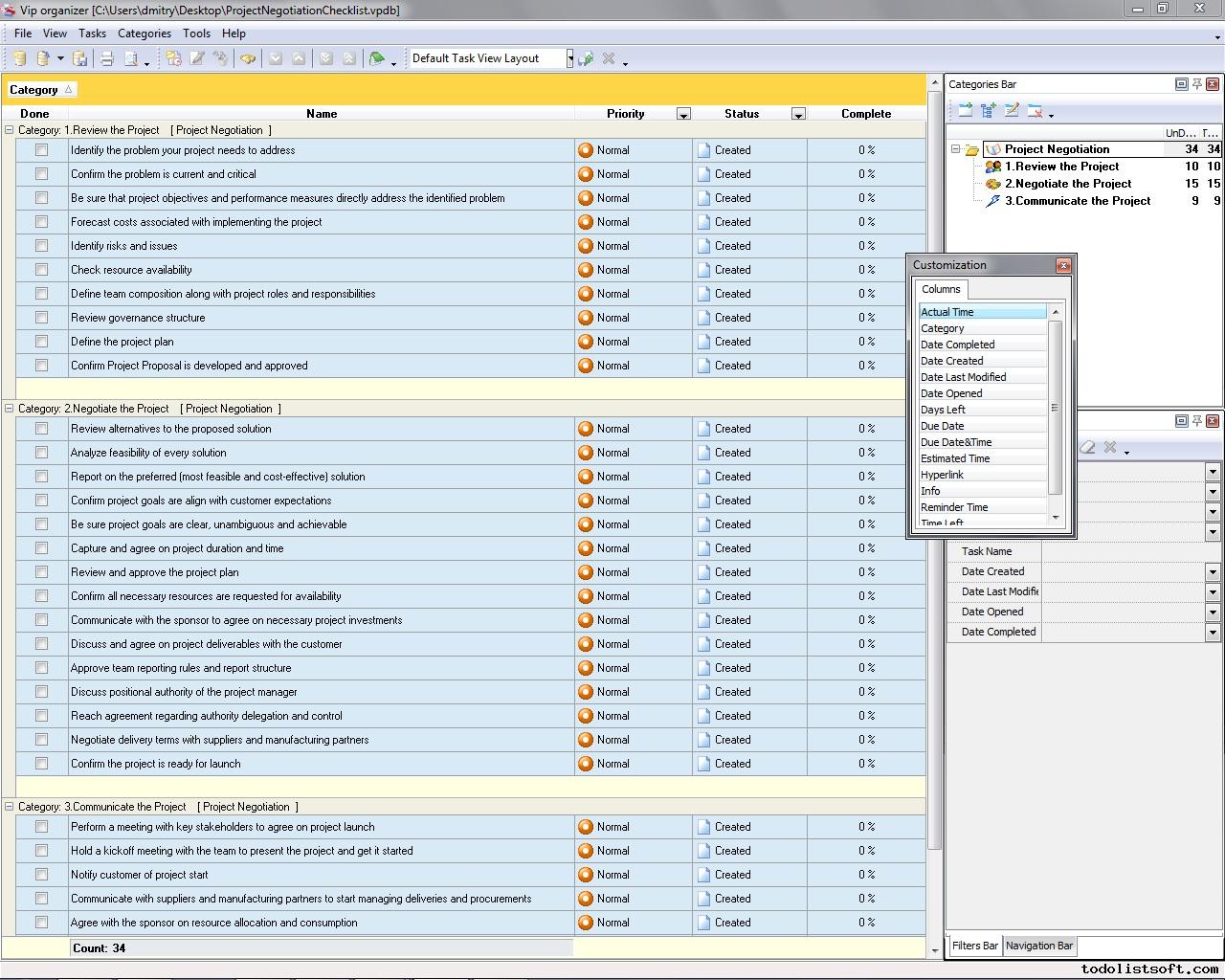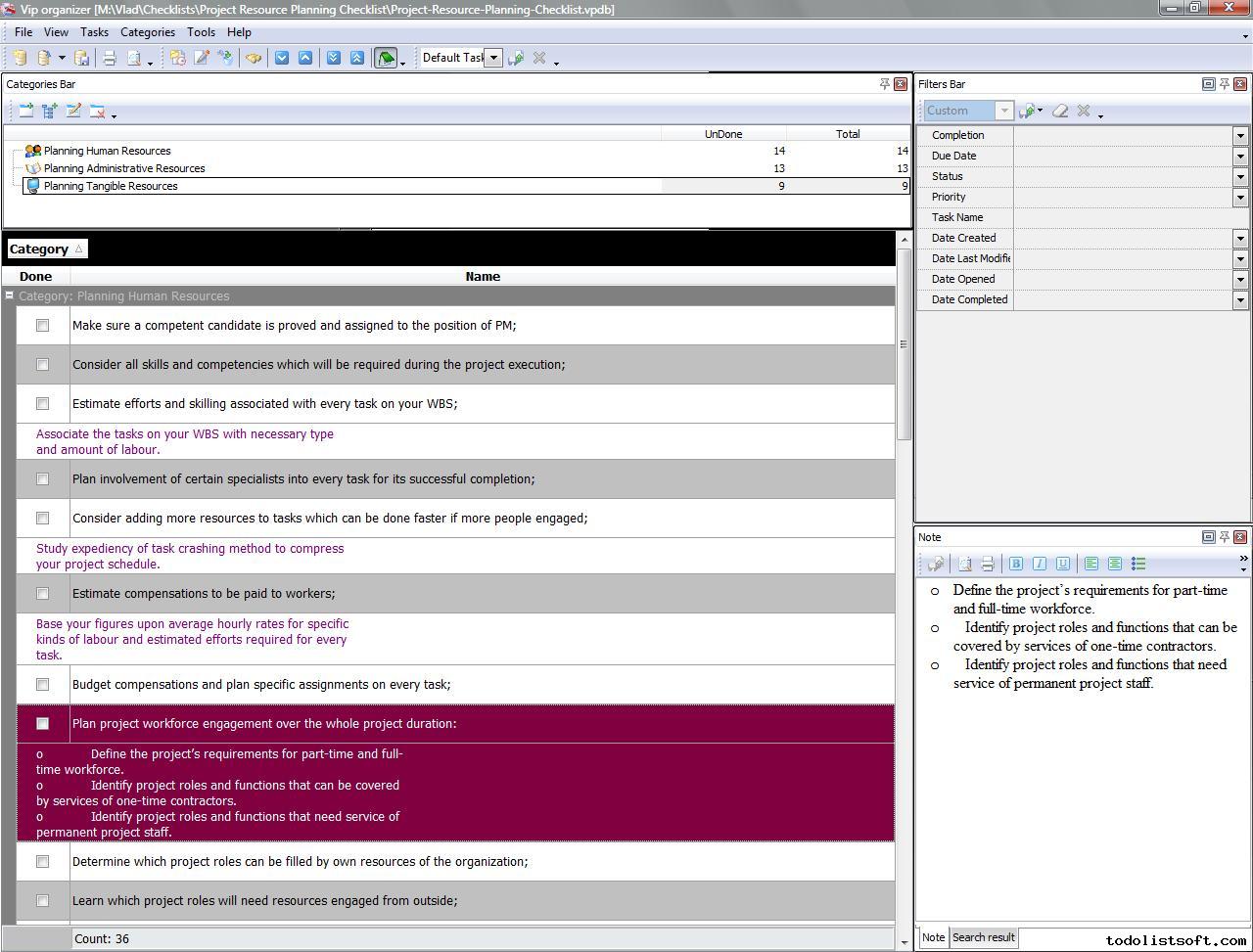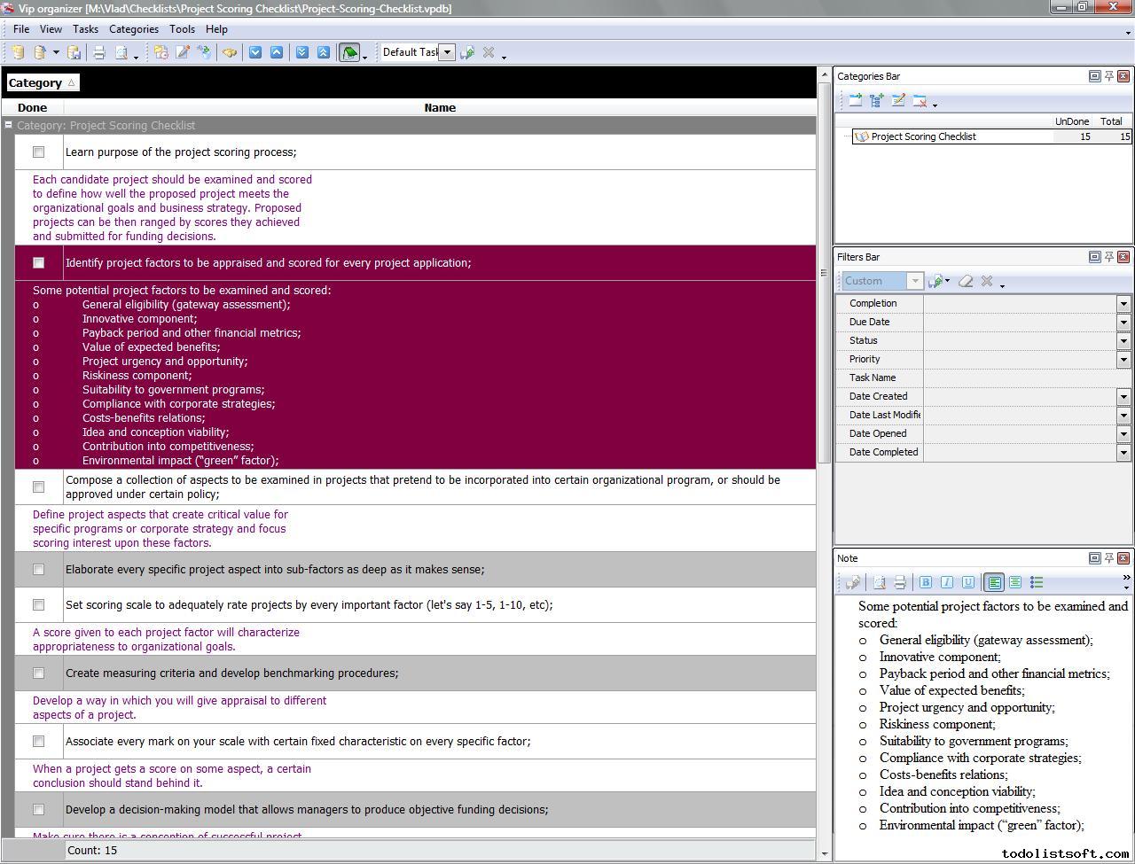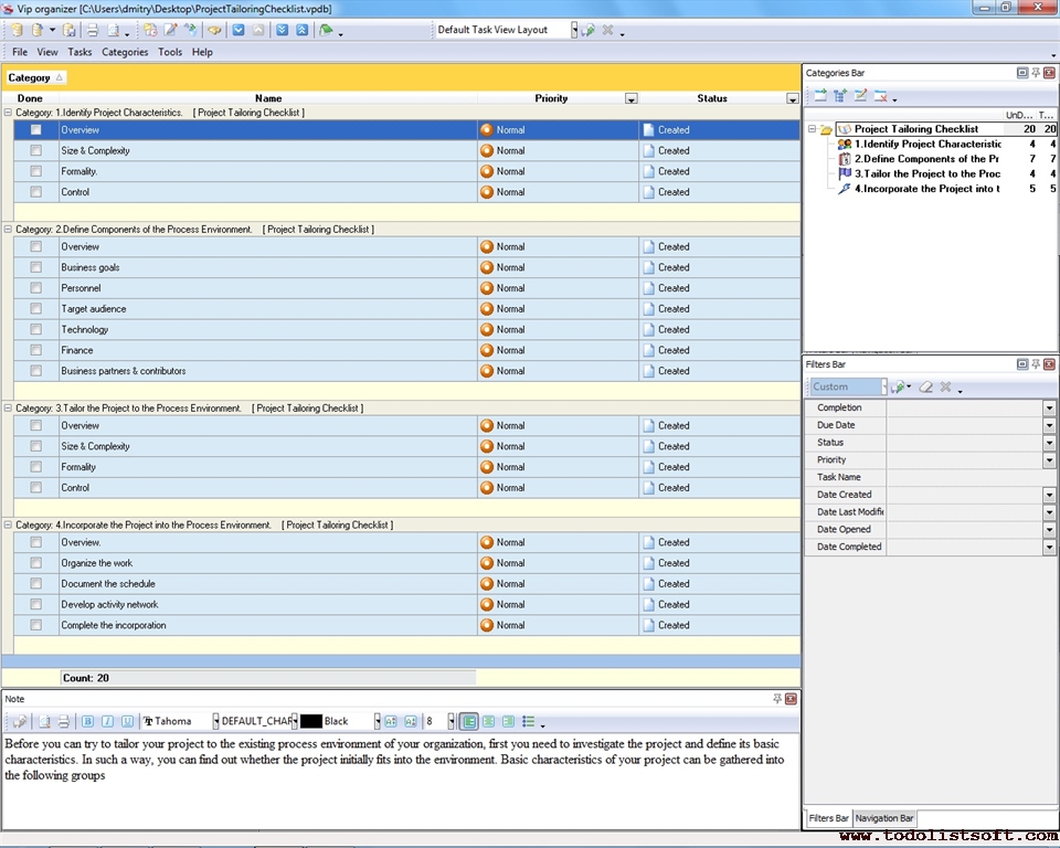 Use this Project Tailoring Checklist to tailor and incorporate your project to the business process environment of your organization. The checklist is a step-by-step guide that includes a range of tasks. You can use VIP Organizer software to do the checklist.