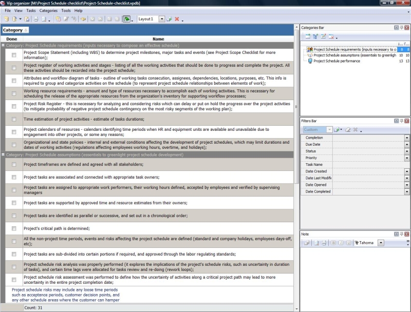 Project scheduling is a process that states how to manage time and resources to accomplish work. Use a scheduling software tool (VIP Task Manager is recommended) and t his developing project schedule checklist to plan and track the schedule of your project.