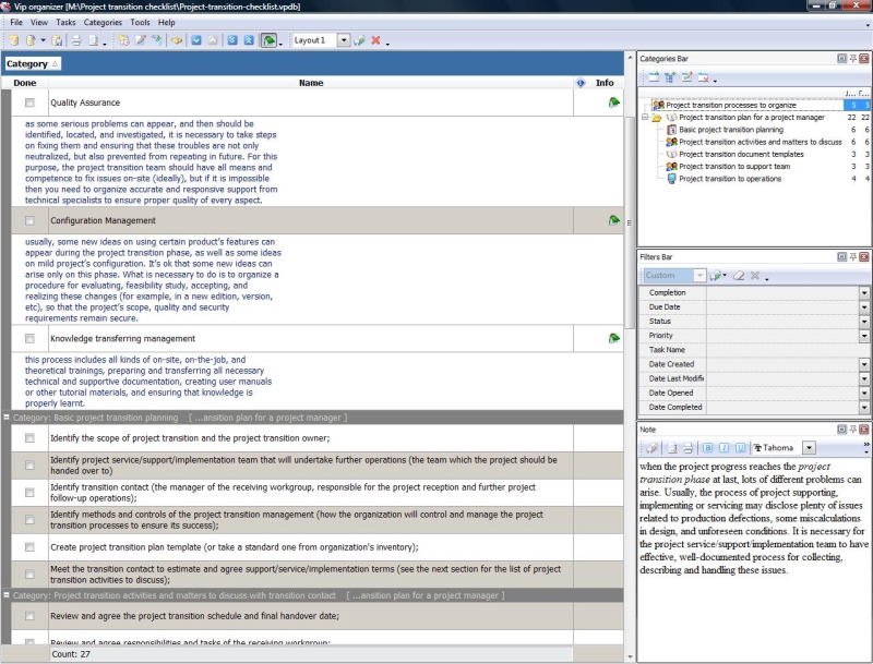 This project transition checklist explains how to undertake the procedure of handing over the project from its producers (executers) to support or operation team of project’s customers, owners or sponsors. It necessary to make sure that a set of essentials processes is established, and the project transition plan is prepared. This project transition checklist will help you to organize and control this procedure.