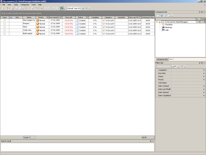 Most hotel managers have a broad set of usual tasks and responsibilities, from greeting new guests to managing financial resources. The manager of a large hotel may have to coordinate and monitor the progress of reception duties or serving meals if the need arises. He has intensive workday which requires good organization of tasks. Task management software helps to arrange workday by organizing all tasks into categories and subcategories. Hotel manager can break down his workday into several categories with tasks that should be completed during the day. For example, the category "Hotel Services" may include such tasks as "Call to furniture supplier to order new chairs and tables", "Check food furnishing", etc. Filter Panel allows to filter tasks by date range and priority so hotel manager will easily find tasks assigned for today, tomorrow, etc.