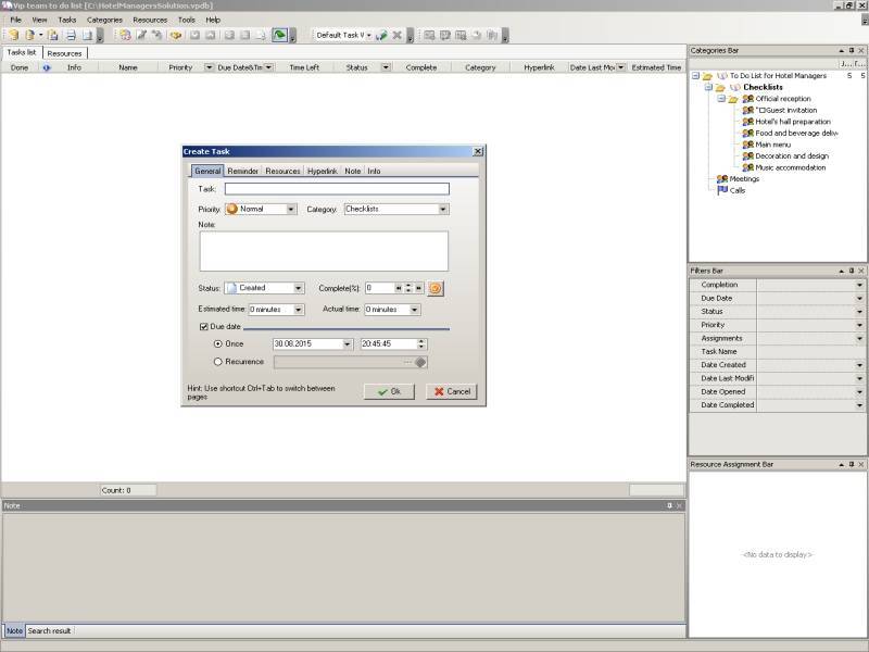 | Hotel manager can create such checklists by using task management software. Certainly the checklist for the official reception may be larger and include more tasks. However, this example obviously demonstrates that event management can be efficient, and hotel manager can do his best with task management software to arrange events in hotel.