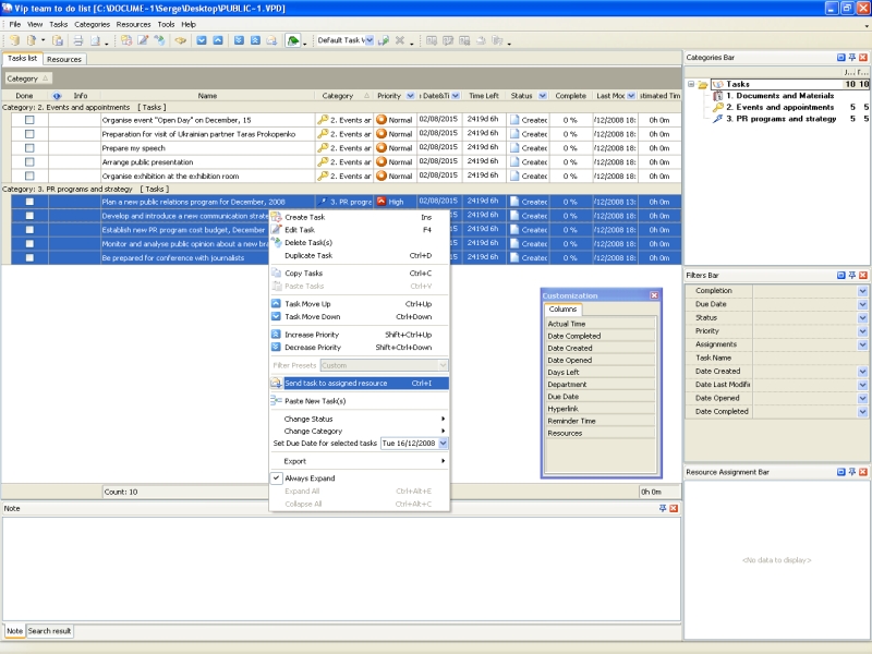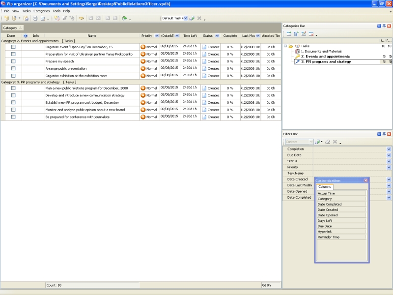 • VIP Organizer. VIP Organizer is the best solution for the public relations managers who work alone and need to manage only their own tasks.