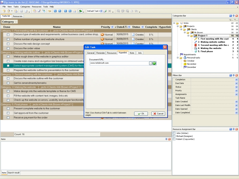 It is extremely helpful for the web designers to make direct task attachment to hyperlinks to files or web pages. The web designer can use such links to speed up his work and get quick access to the web design projects published in the internet or to content materials used while designing a web page. Task management software allows to use hyperlinks and local links in task list. The software gives direct access to the web resource from the task list and can be used as a links library. |