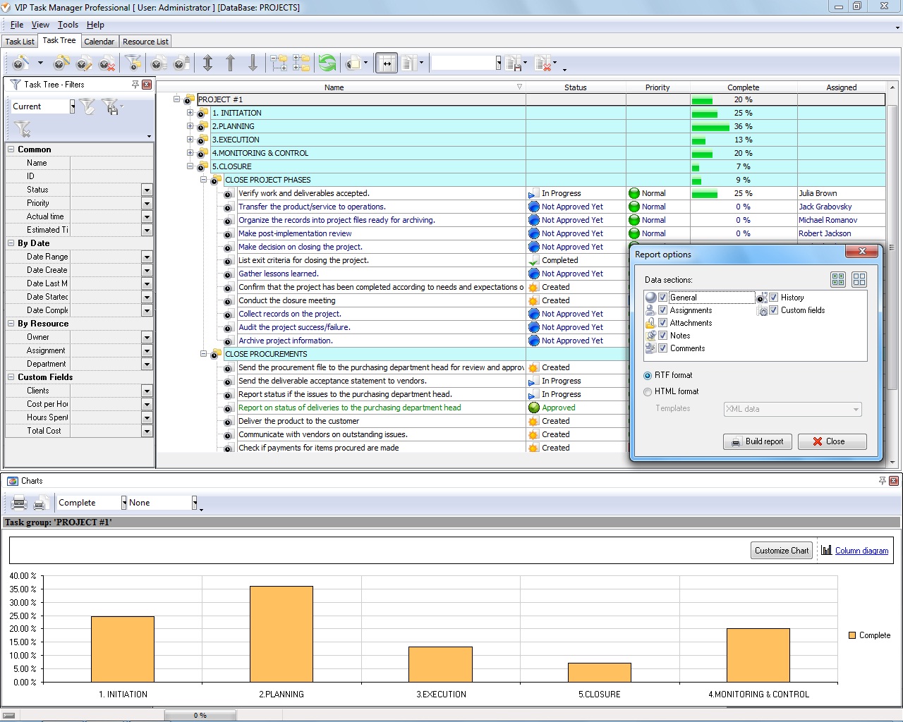 All the activities of the execution phase can be managed with help of VIP Task Manager. You can divide the processes into simple tasks and then use the software to assign these tasks to your project team. The project manager can use Task List view to design to-do lists and create separate tasks. Due Date, Assignment, Priority, Time Left, Complete and other task attributes will help plan and track tasks of the execution phase.