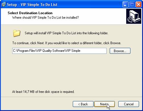 If you want the shortcuts to be placed at a particular location you should click on ‘Browse’ button and select this location. Otherwise the shortcuts will be created in VIP Quality Software in Start Menu folder. Click ‘Next’