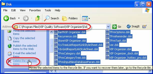 If the previous actions didn’t help, go to C:\Program Files\VIP Quality Software\VIP Organizer\Dsk (for VIP Organizer) and delete all files from this folder