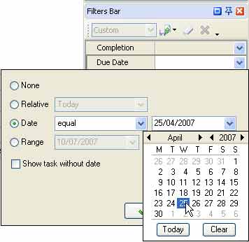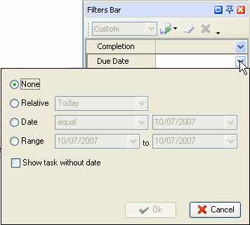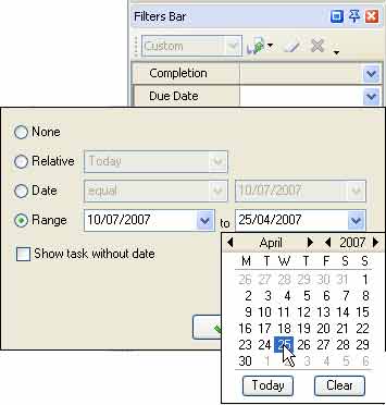 To display the tasks with Due date from required time interval check Range radio button and set required period of time with the help of drop-down time boxes.