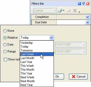 Check Relative radio button to view the tasks which should be done by definite time or during the definite period of time. In drop-down list select required date or period of time.